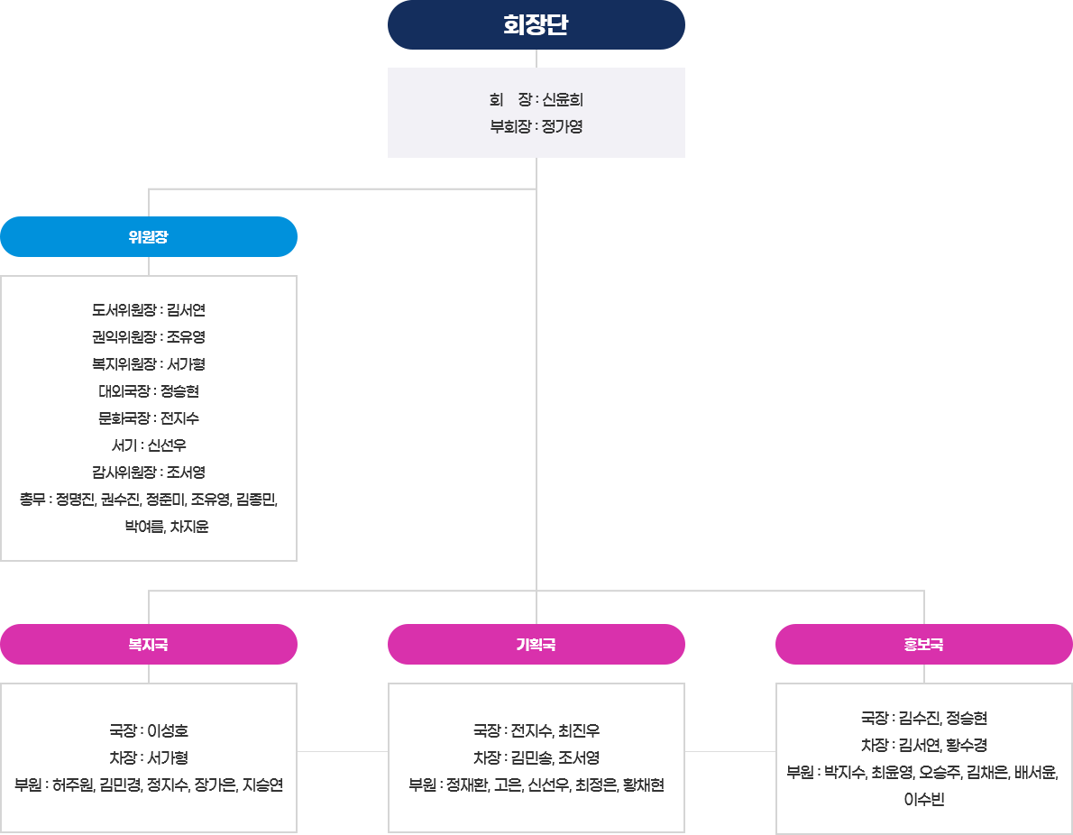 - 총무부 : 학생회비 예산을 심의하며 출납 관리를 비롯하여 학생회장단의 업무를 재정적으로 밀접하게 돕는 역할을 담당하고 있습니다.