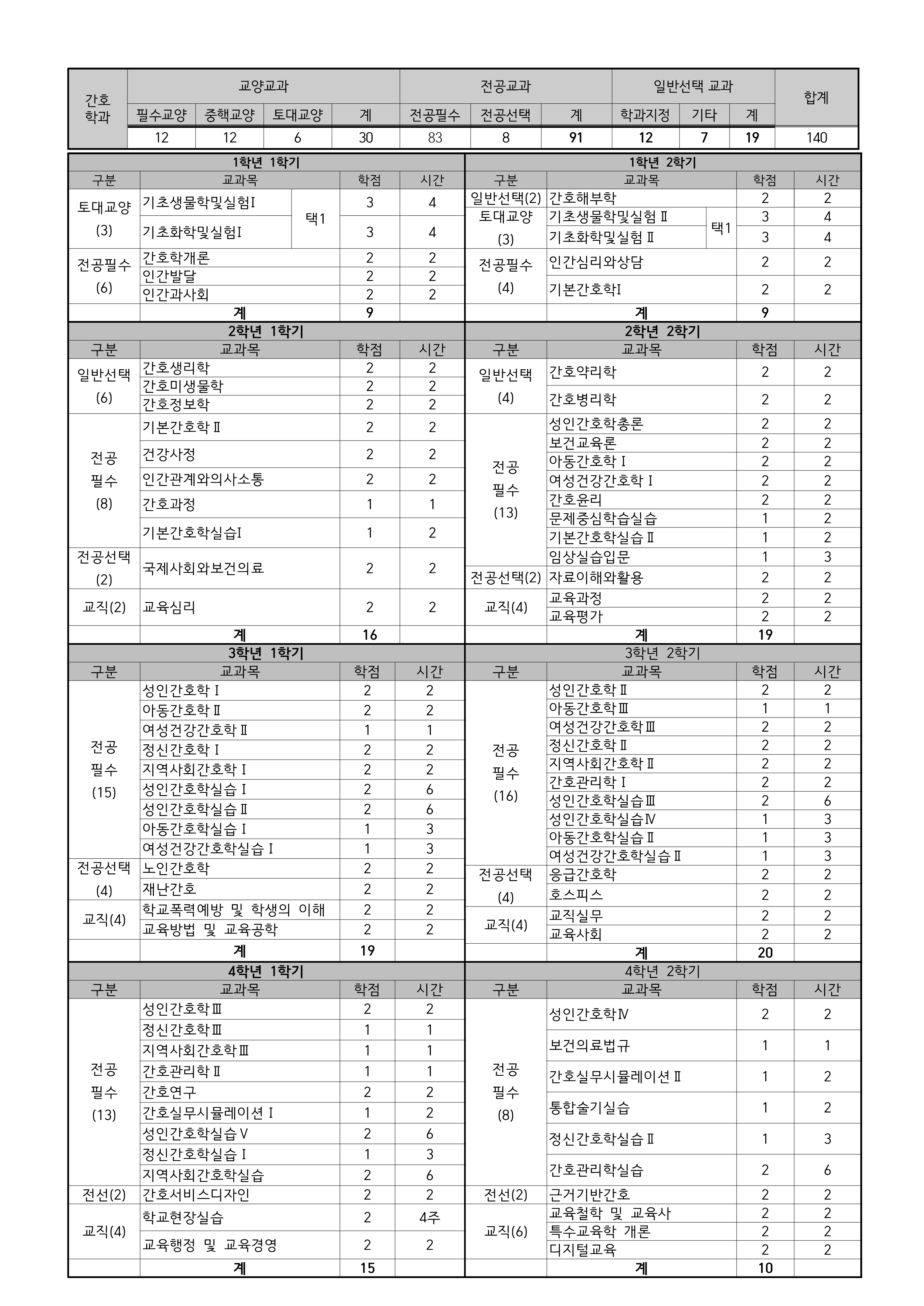 교과과정 열린 미래 꿈이있는 대학, 동아대학교 메인으로 이동 교과과정 대학소개 PIVOT 시뮬레이션 센터 입학안내 교과과정 학생활동 커뮤니티 취업안내 동문 기타 닫기 교과과정 교과과정 일반대학원과정 중환자전문과정 감염관리전문과정 Job Tree 진로로드맵(EDUMAP) 닫기 교과과정 교과과정 교과과정 일반대학원과정 중환자전문과정 감염관리전문과정 Job Tree 진로로드맵(EDUMAP) 교과과정 SNS 목록열기 FACEBOOK 공유하기 TWITTER 공유하기 BLOG 공유하기 SNS 목록닫기 인쇄 url 복사 2026학년도 교과과정 2024~2025학년도 교과과정 2023학년도 교과과정 2021~2022학년도 교과과정 2019~2020학년도 교과과정 < 2026학년도(입학) 간호학과 교육과정 >※ 일반선택의 경우 학과지정 교과목은 간호학과 교육과정 표에 나와있는 일반선택 교과목이고, 기타 교과목은 일반선택 영역에 개설된 교과목에서 자유롭게 이수하면 됨